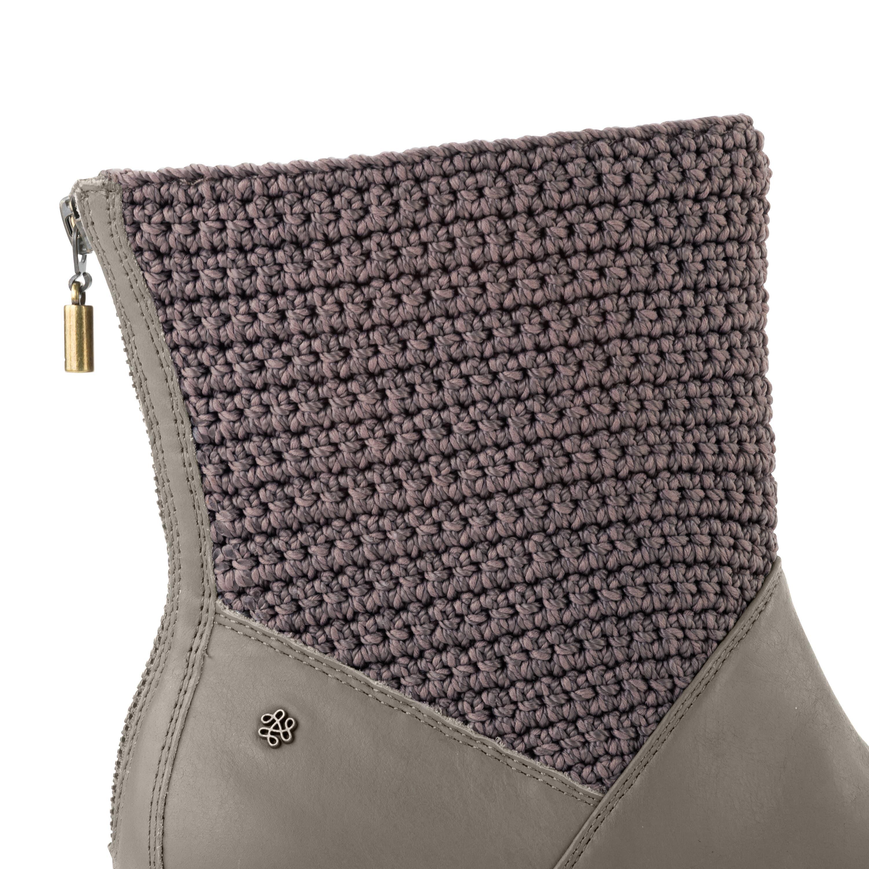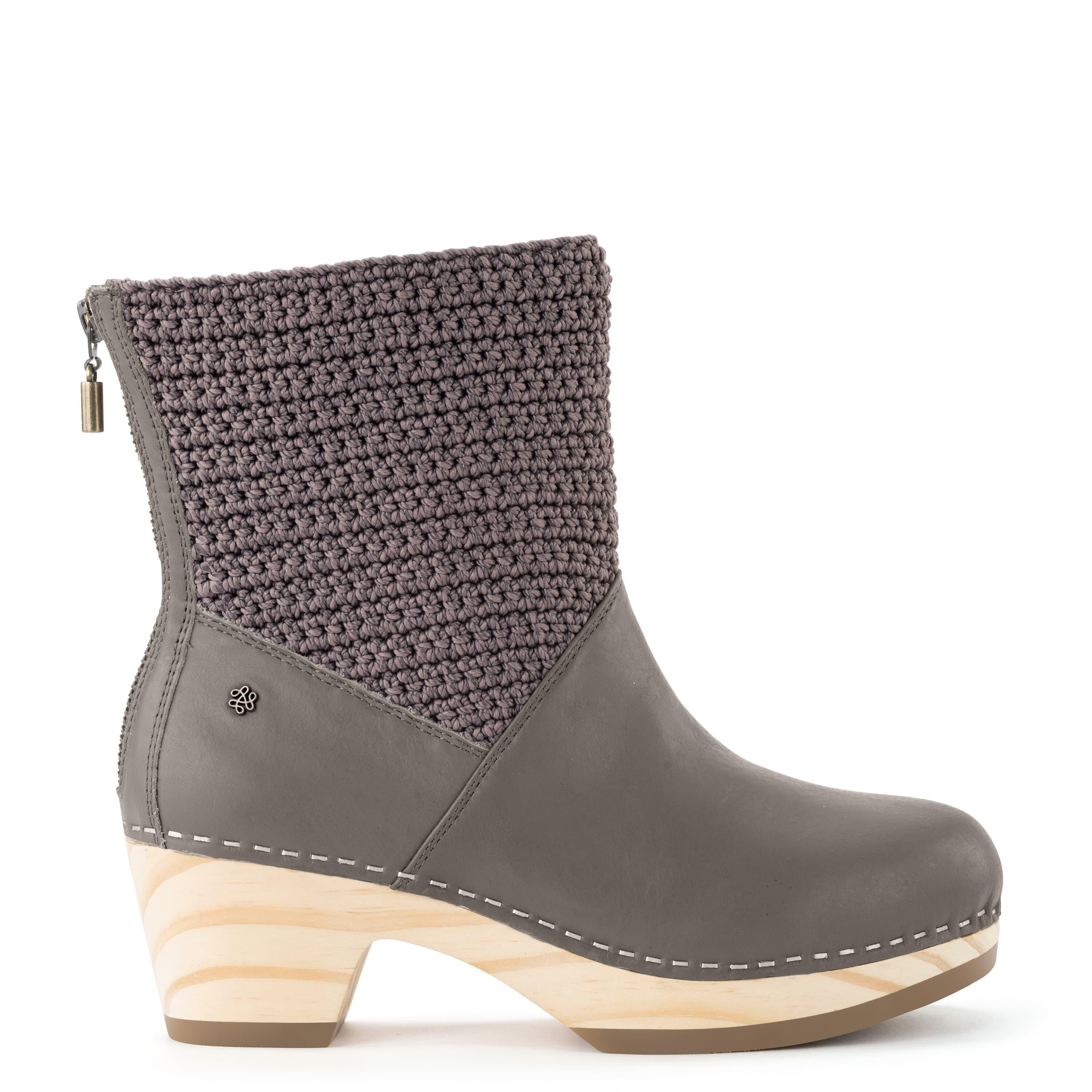 Style and comfort combine with these boots. They feature classic clog styling with a mixed hand-crochet and leather upper, perfect for styling with or without socks for casual-cool looks. Elevated on a wooden heal and secured with an exposed back zip.
